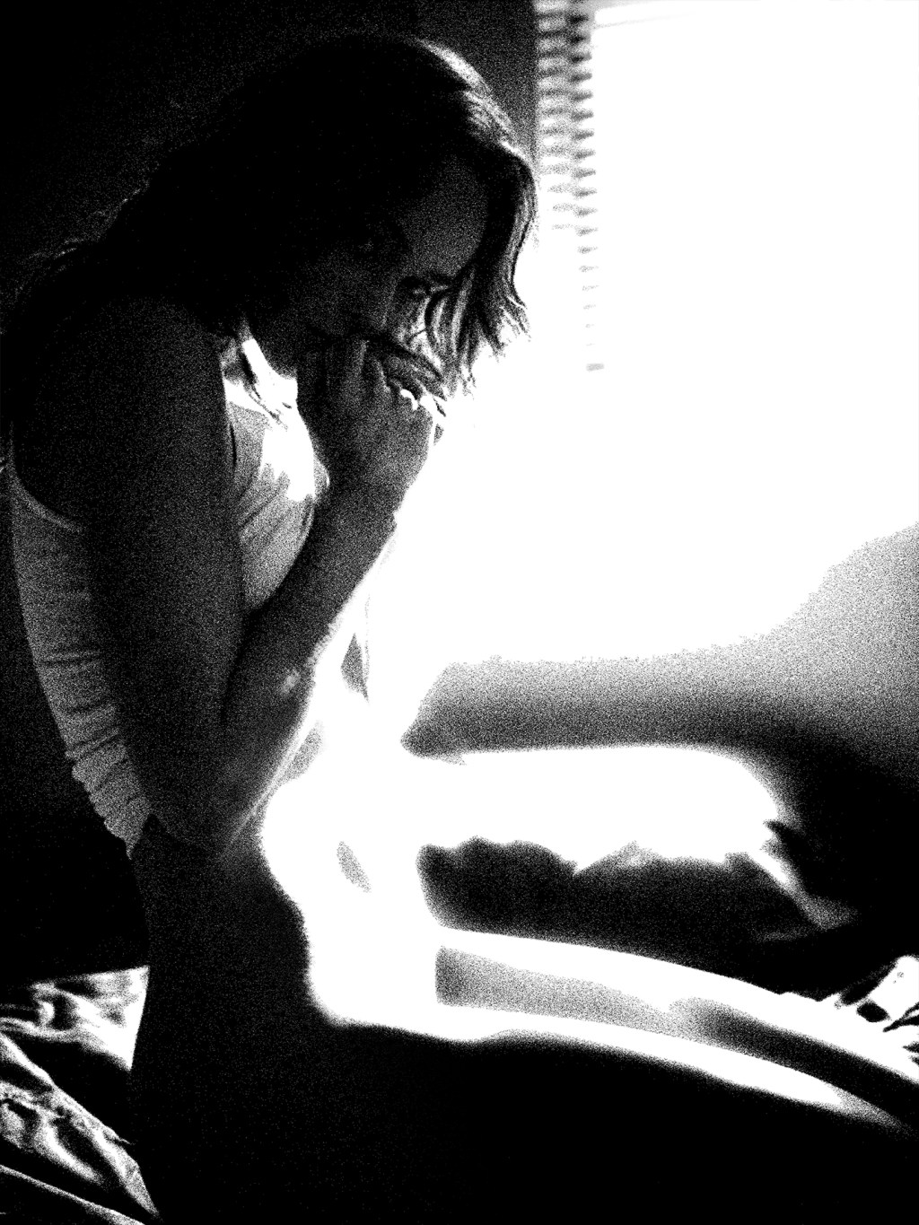 Her body folds inward, touched by the sharp glow of the window, as if caught between thought and confession. Shadows cradle her, leaving the mind to wonder what lingers behind those lowered eyes.