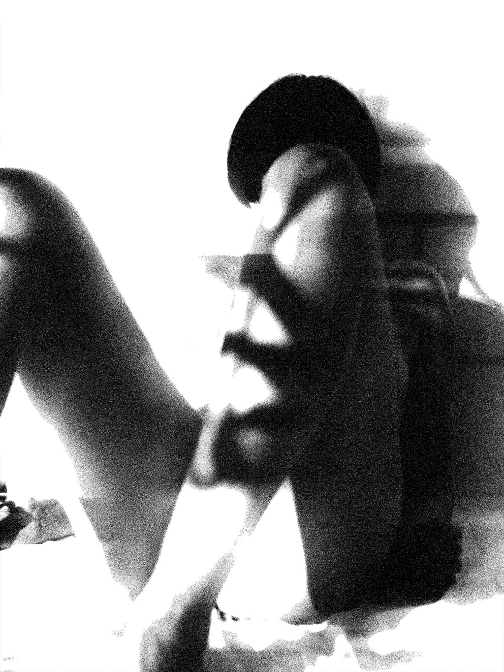 The body folds into itself, doubled and blurred, as if two selves are struggling for space within the same light. Limbs stretch wide, yet the posture feels inward, protective, unresolved.