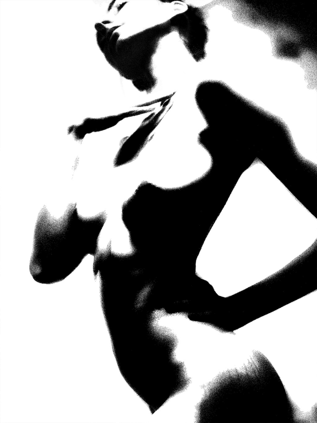 Head tilted skyward, the form stretches into light, every curve sharpened by shadow. One hand grips the collar, a gesture both vulnerable and commanding.