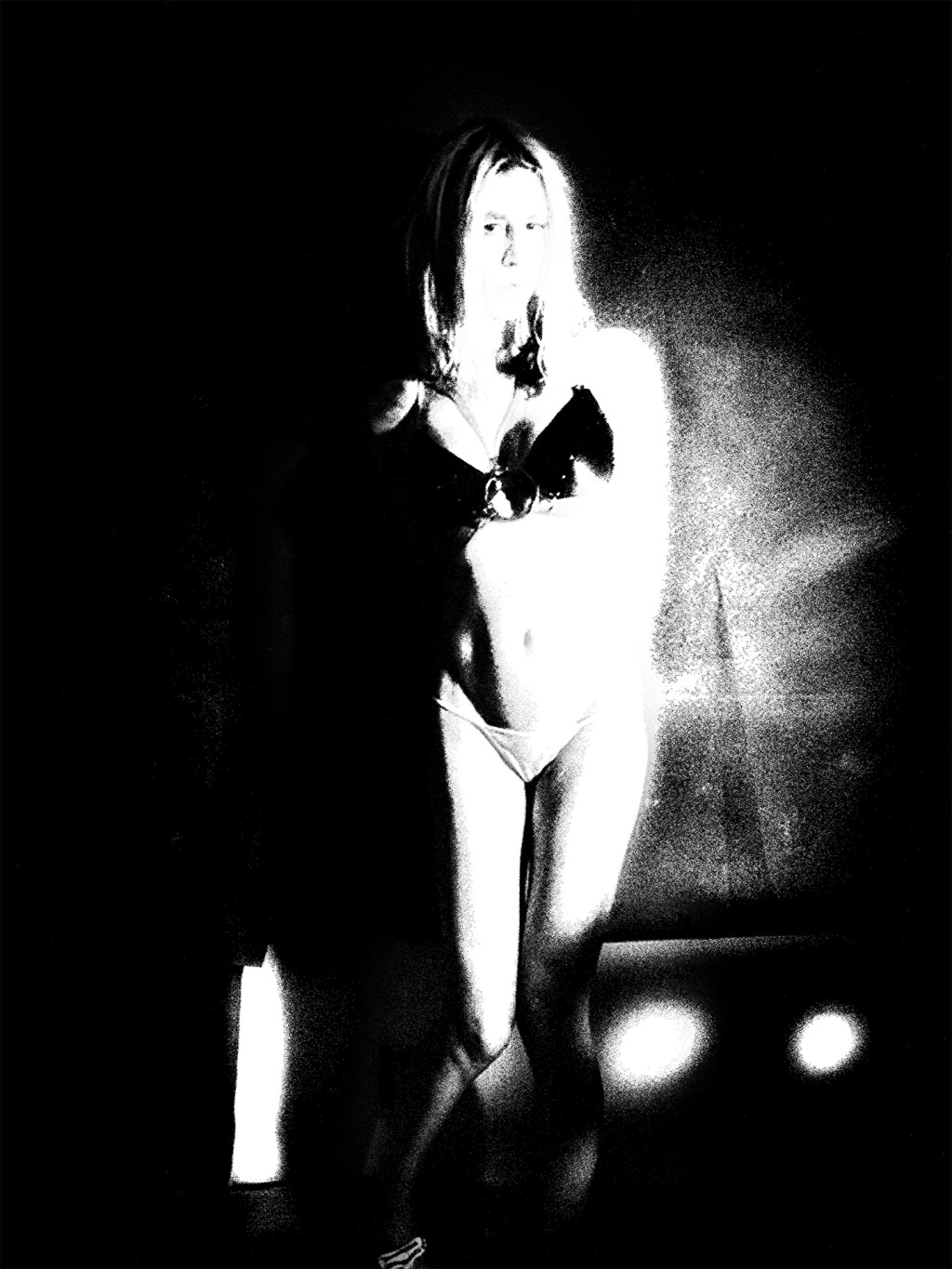 Her body rises out of shadow, a beacon framed in stark brilliance. Strength and softness intertwine, standing unshaken in the void that surrounds her.