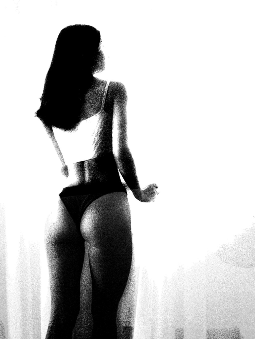 She stands at the edge of brightness,body sculpted by shadow, face turned toward something unseen.
