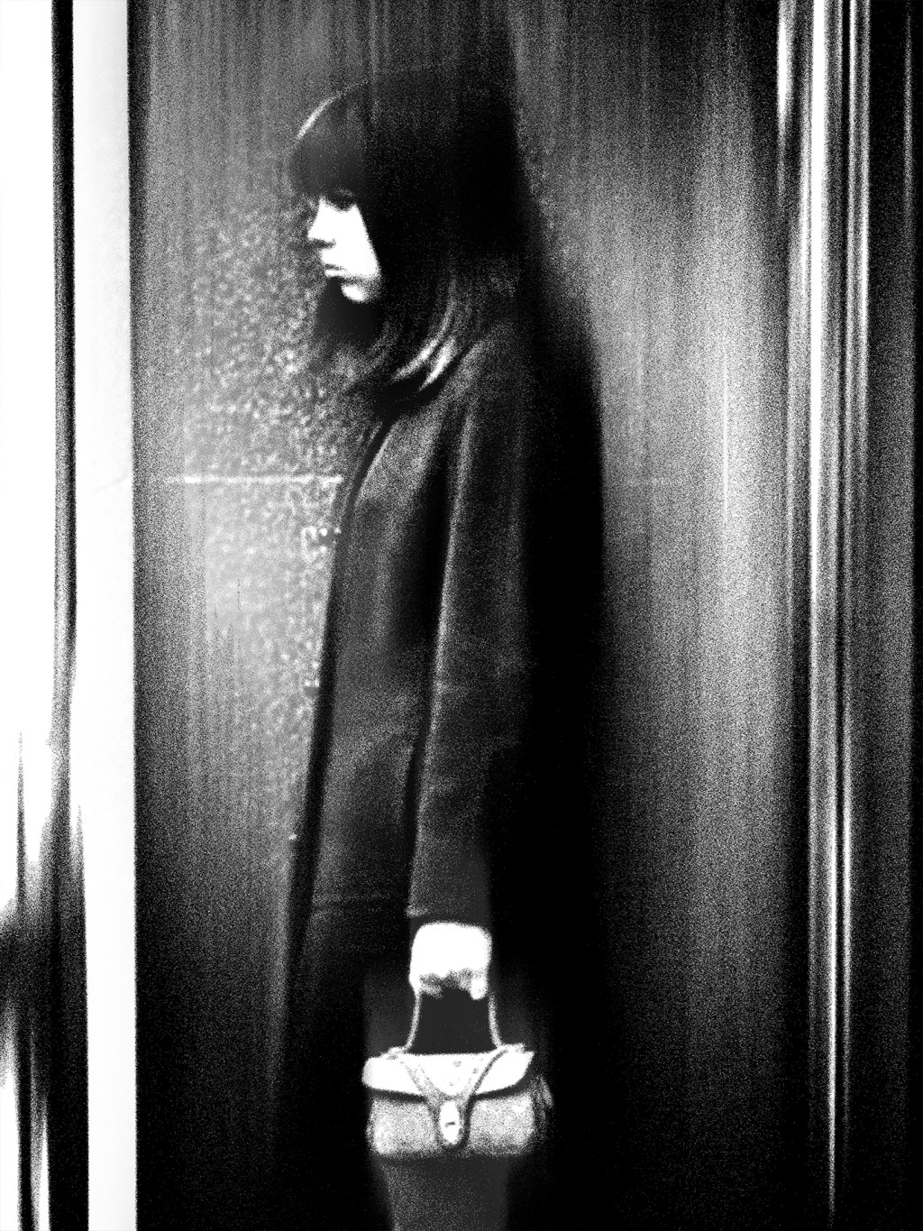 She stands in grayscale silence, pressed between walls and time.