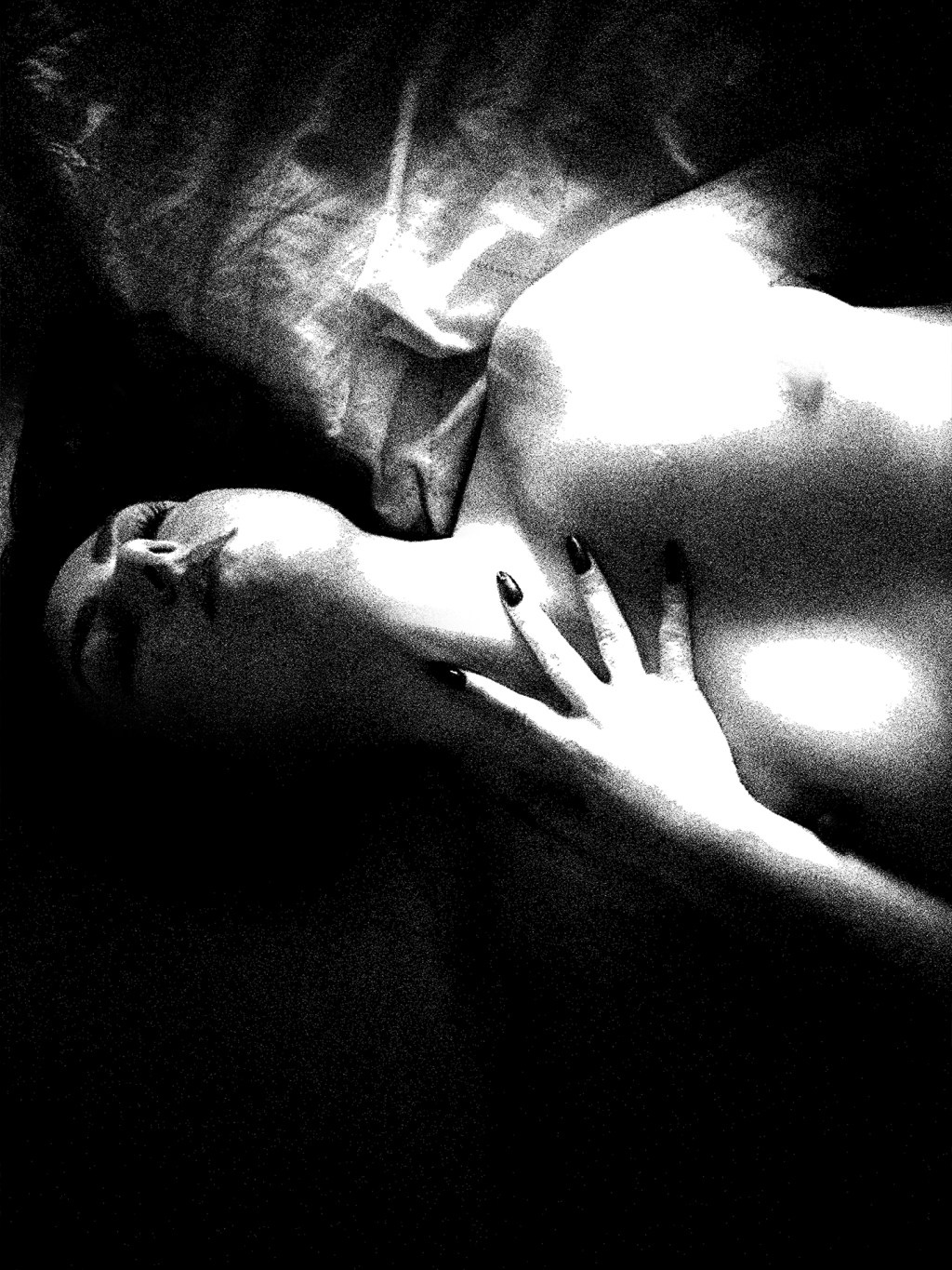 In the shadow and glare, a quiet storm breathes. Her hand—half anchor, half surrender—finds the place where pulse meets silence. The image trembles between peace and ache, between light and letting go.