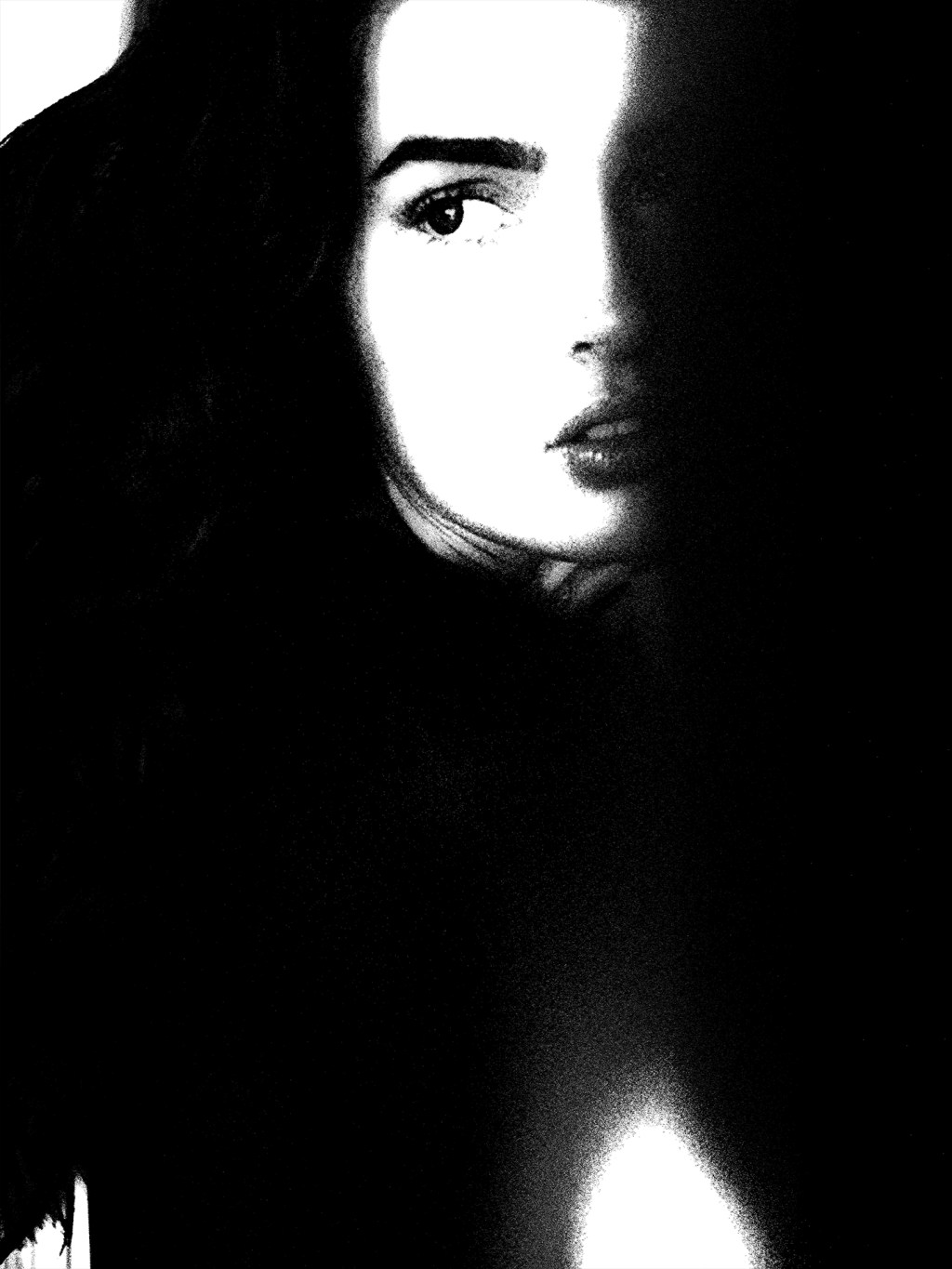 Light slices through mystery, dividing her into presence and echo. The gaze holds everything unspoken—fear, beauty, defiance—all living in the hush between shadow and skin. A moment of truth disguised as stillness.