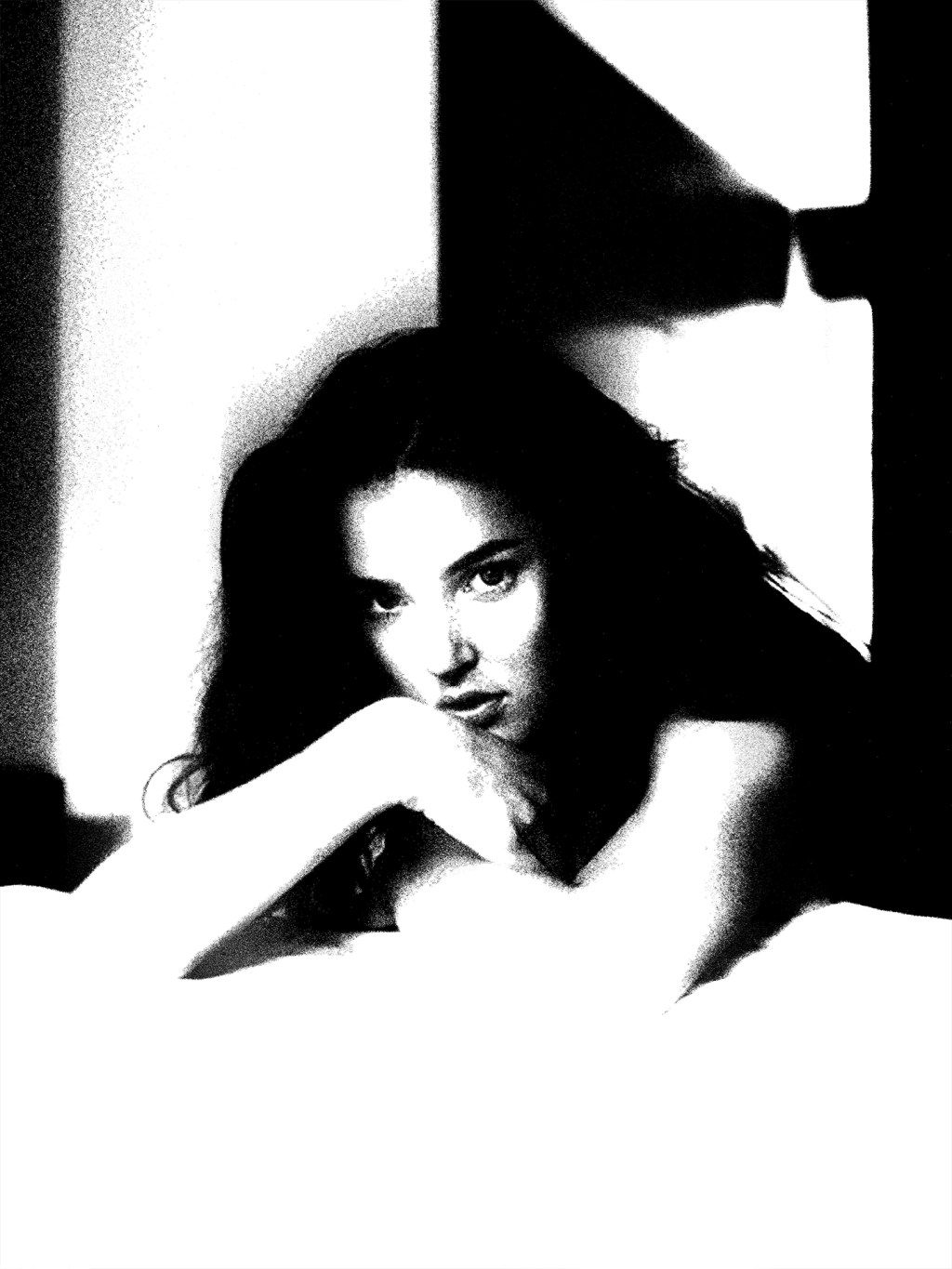 She lies where light meets exhaustion — not defeated, but pausing. Her gaze cuts through the stillness like a secret she’s not ready to share. The room hums softly with the weight of morning and memory.