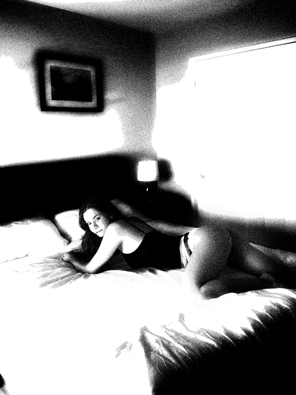 Morning light spills like confession — sharp, unfiltered, real. The room hums in grayscale, where comfort meets vulnerability. She stretches across the silence, halfway between dream and awakening.