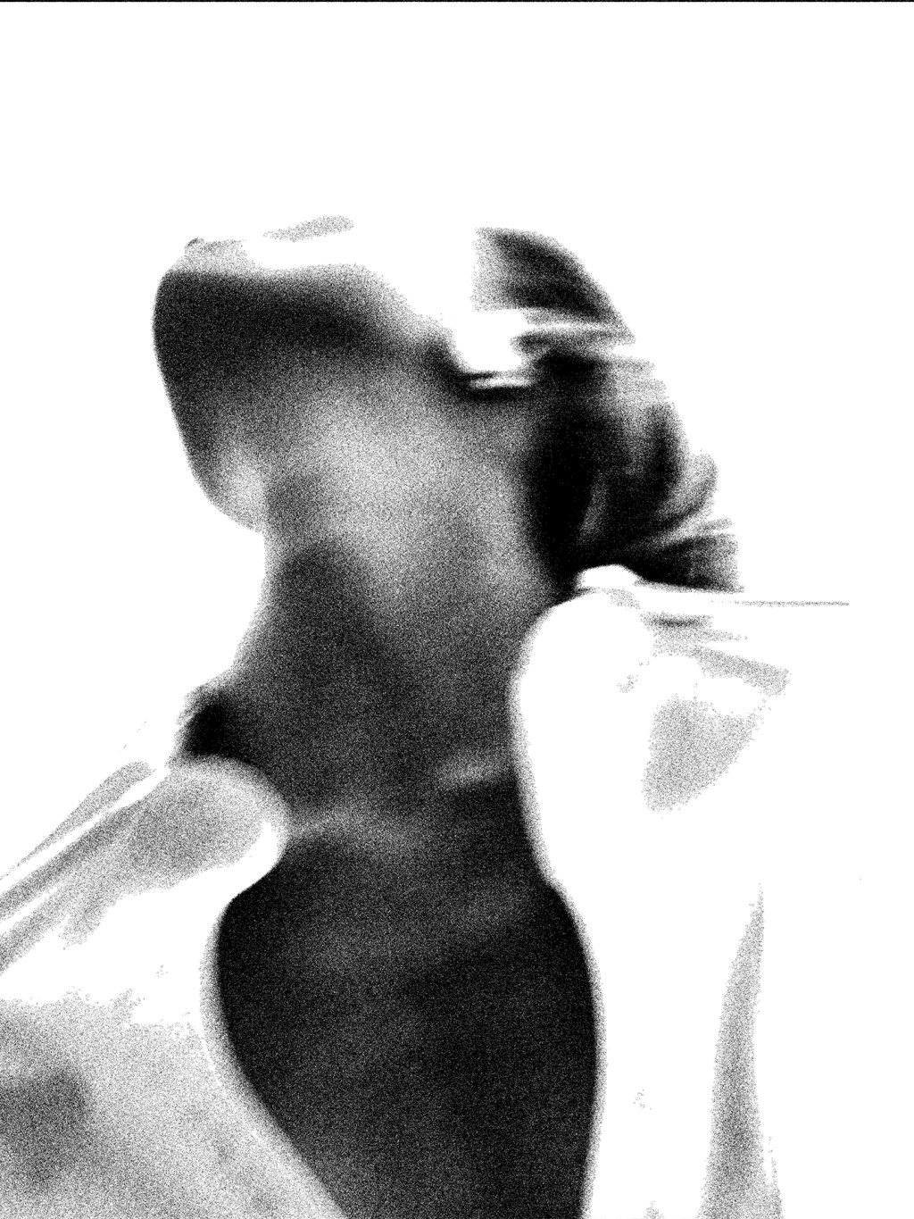 She dissolves into brightness, as if caught mid-breath between vanishing and rebirth. The motion feels sacred—an exhale turned into surrender, a body remembering it was once light.