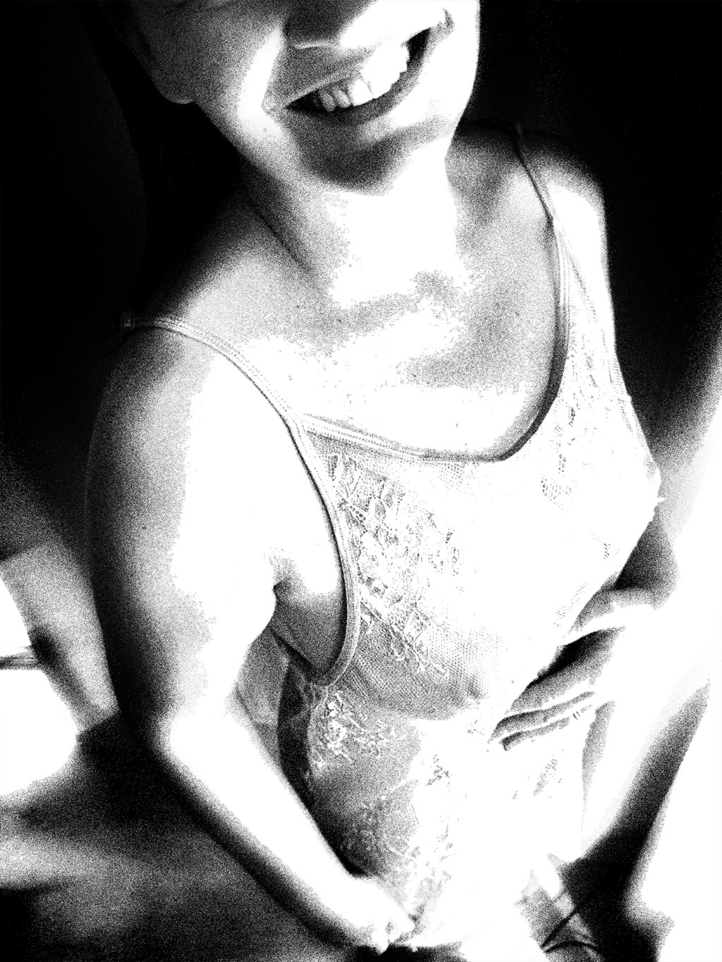 There’s a brightness here that no contrast can contain. The lace, the play of light — they all bow to the power of that smile. It’s not just joy; it’s quiet rebellion, the kind that turns vulnerability into radiance. The tilt of her body, the softness of fabric against skin, the effortless way she exists between shadow and glow — it’s all a kind of honesty, unposed and unforgettable. She isn’t performing for the camera. She’s simply being. And that, in all its raw, luminous truth, is what makes her breathtaking.