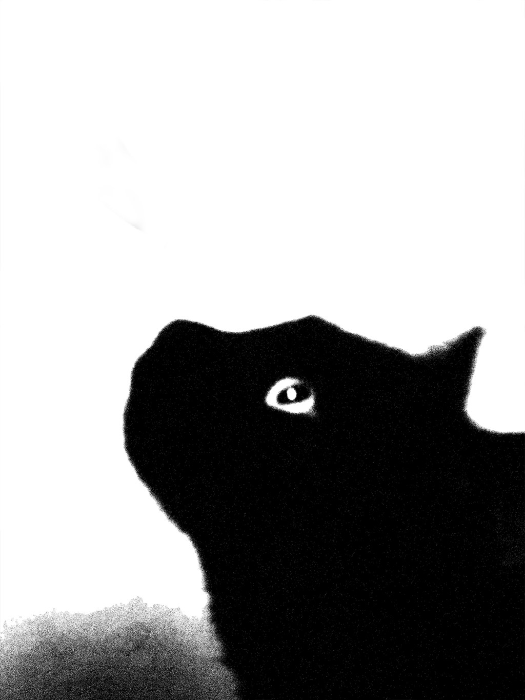 A single gaze pierces the vast white silence—curious, calm, eternal. The dark form feels carved from shadow itself, yet its eye holds a spark of wonder, small as breath, infinite as night.