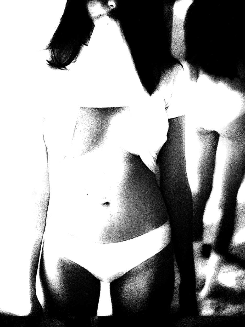 Light clings to her form, revealing just enough to become a question. The lifted fabric, the pause—it feels like a breath between thoughts, intimate but uncertain. Reflection blurs behind her, a ghost of what remains unseen.
